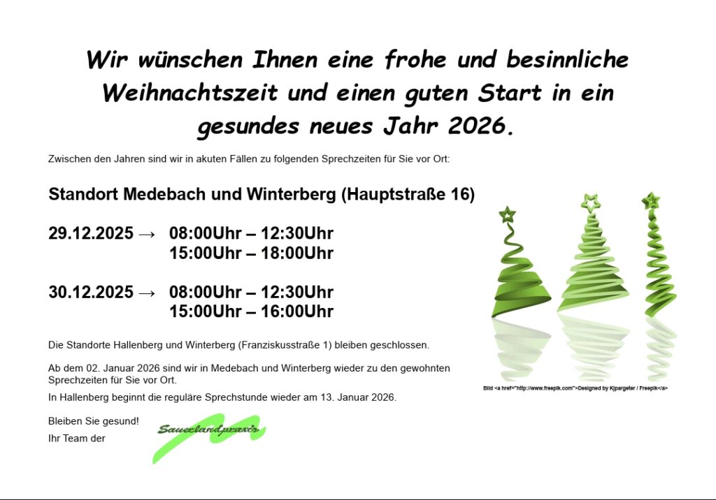 Aus betrieblichen Gründen bleiben unsere Praxen an folgenden Tagen geschlossen: 14.10. – 21.10.25 Hallenberg 15.10. – 16.10.25 Medebach In dringenden Angelegenheiten wenden Sie sich an unsere Praxis in Winterberg (Franziskusstr. 1) 20.10. – 24.10.25 Winterberg (Franziskusstr. 1) In dringenden Angelegenheiten wenden Sie sich an unsere Praxis in Winterberg (Hauptstr. 16) Vielen Dank für Ihr Verständnis